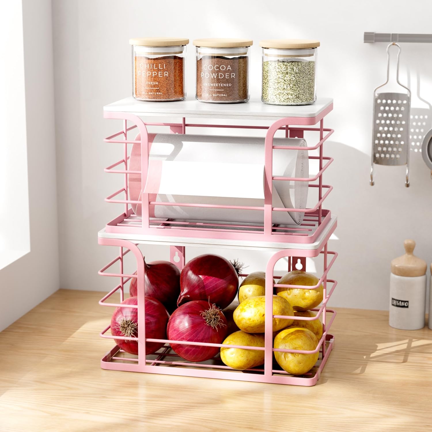 2 Pack Extra Large Stackable Pantry Storage with Bamboo Top,Wall Mount Trash Bag Dispenser Roll Holder for Kitchen Pantry Laundry Room,Pink