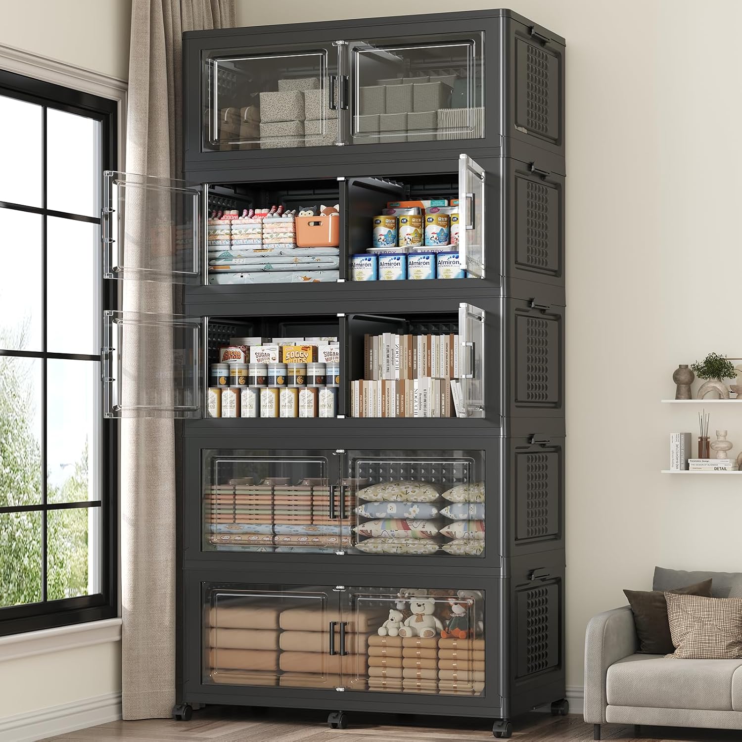 - 【Two Ways to Open & Clear Magnetic Door】The collapsible storage bins with lids and wheels feature a dual access way, allowing for both top and front door openings, and with clear windows for easy visibility. The stackable plastic storage bins with open front doors are equipped with magnetic lock buckles to prevent dust from entering the cabinet.