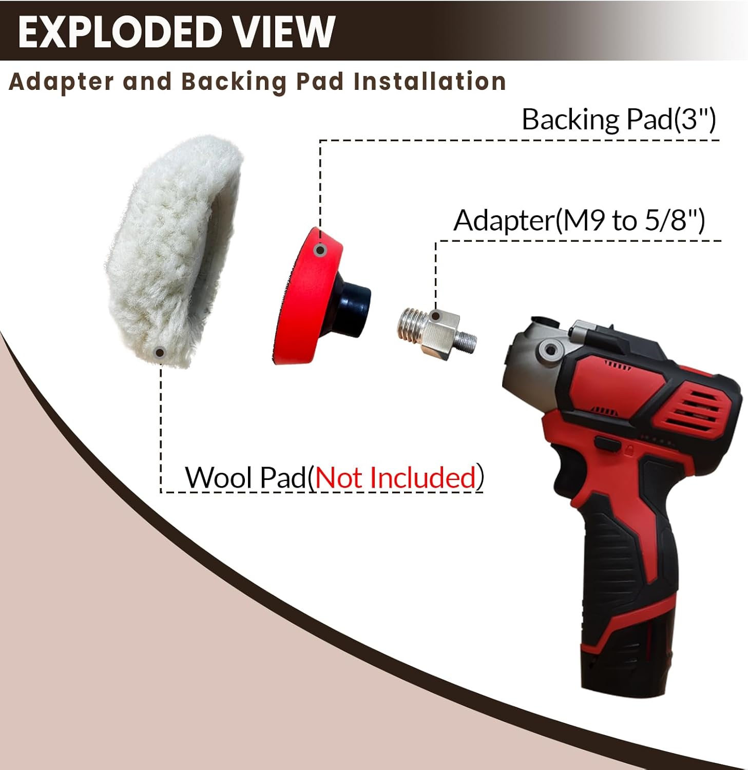 3" Hook and Loop Sanding/Polishing Backing Pad, M9 to 5/8-11 Hex Grinding Bit Thread Adapter, for Milwaukee M12 Polishers/Sanders with M9 Spindle Threads