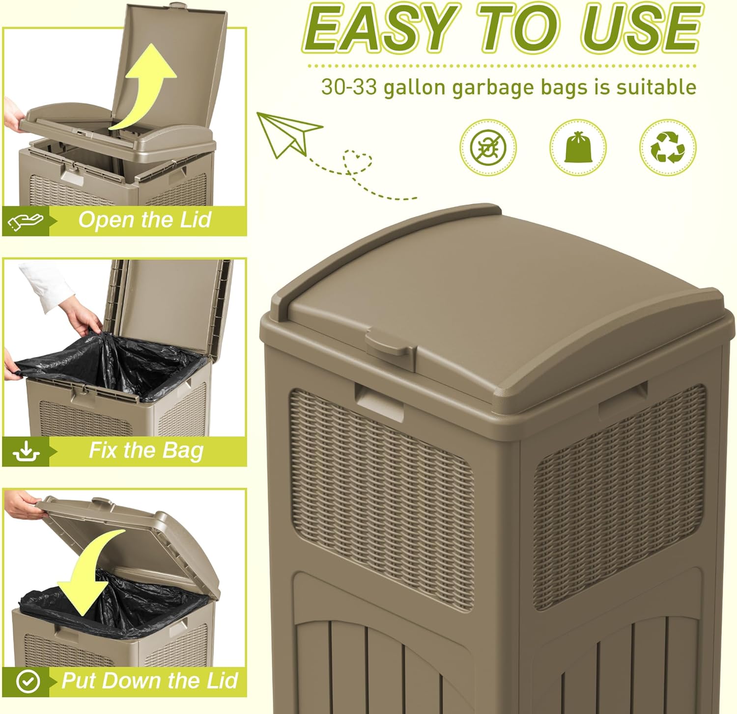 - Spacious & Versatile: With a 33-gallon capacity (fits standard 30-33 gal bags), this bin stores ample waste for patios, BBQs, or pool areas. Dimensions: 16.5”L x 15.7”W x 31.5”H – compact yet roomy!