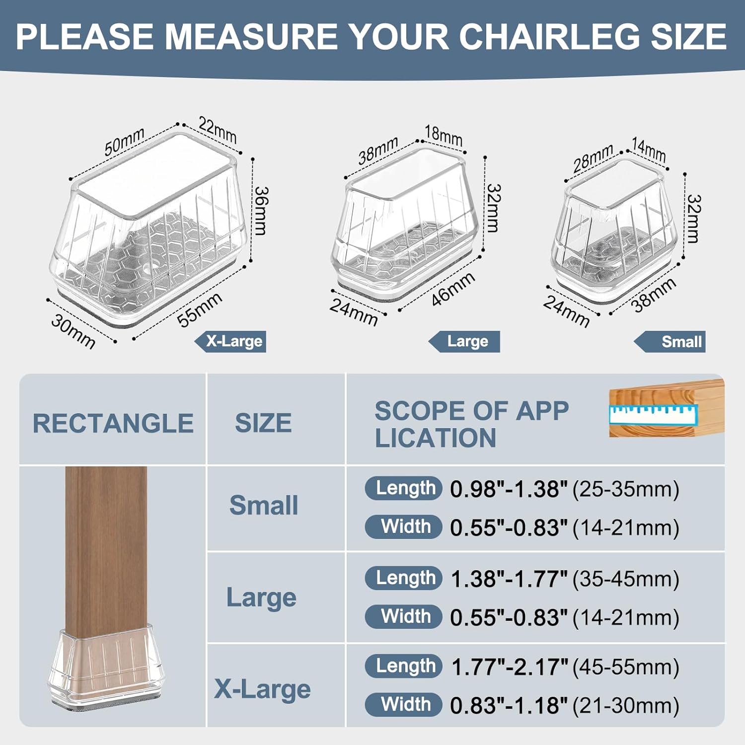- ✅【Applicable Range】The chair leg covers to protect floors fit for rectangular chair legs. Length fit for 1.77''-2.17''(45mm-55mm), width fit for 0.83''-1.18''(21mm-30mm).