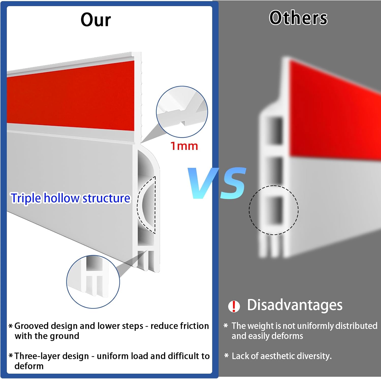 - Triple-Layer Hollow Design: Our door draft stoppers for bottom of door adopts a triple-layer hollow structure that evenly pressure during floor contact when opening the door /closing the door. There is a 1mm groove in the center of the door sweep, which can be bent and adjusted, extend service life while making door opening and closing smoother
