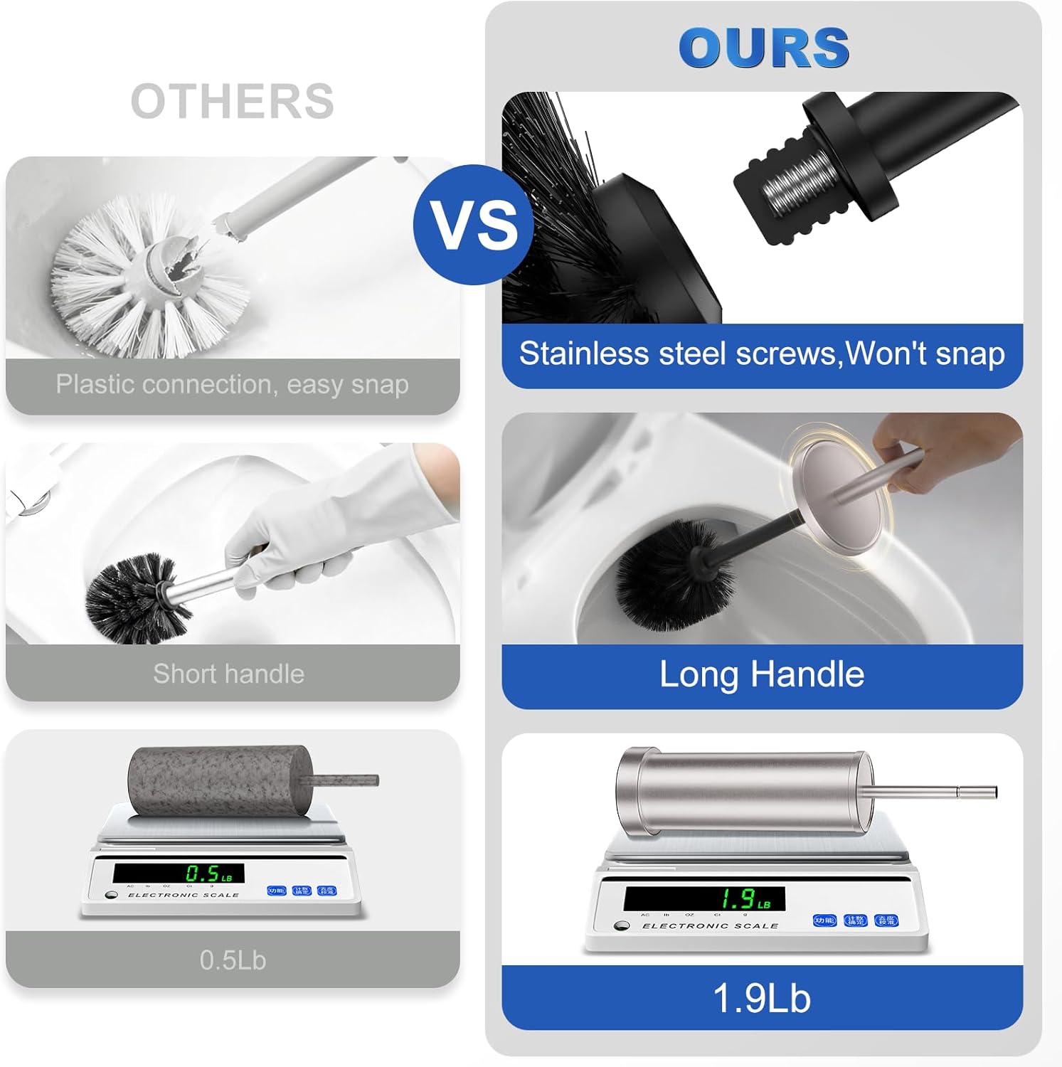 - Durable Stainless Steel & Extended Handle: Crafted with premium 304 stainless steel, this brushed nickel toilet brush and holder set resists-rust for long-term use. Features an extended ergonomic 5.6'' handle and metal screw assembly (not cheap plastic!) for firm, detachable connections that withstand heavy scrubbing. Ideal as a heavy-duty RV toilet brush or daily bathroom essential