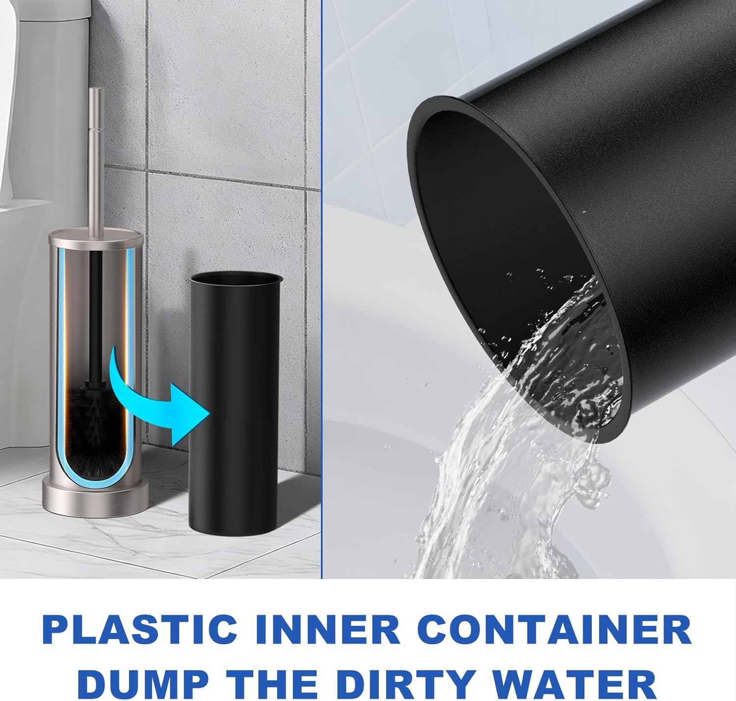 - Detachable Inner Tube & Heavy Duty Base: Stay safe and hygienic! The freestanding toilet brush holder has a weighted base to prevent tipping. Independent inner barrel design allows quick pouring of accumulated water—no more odors. The toilet brush holder comes with a protective sponge at the bottom to avoid scratching your floor when moving