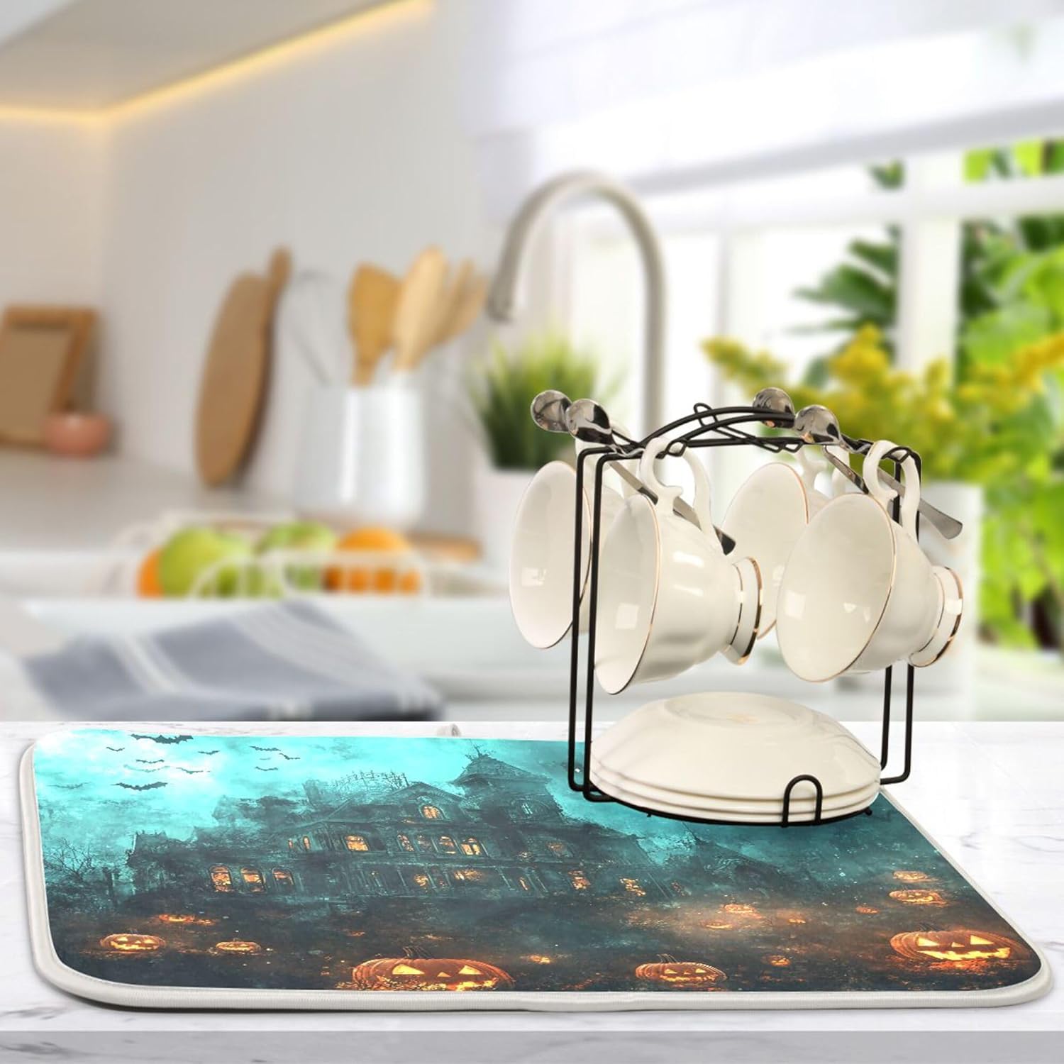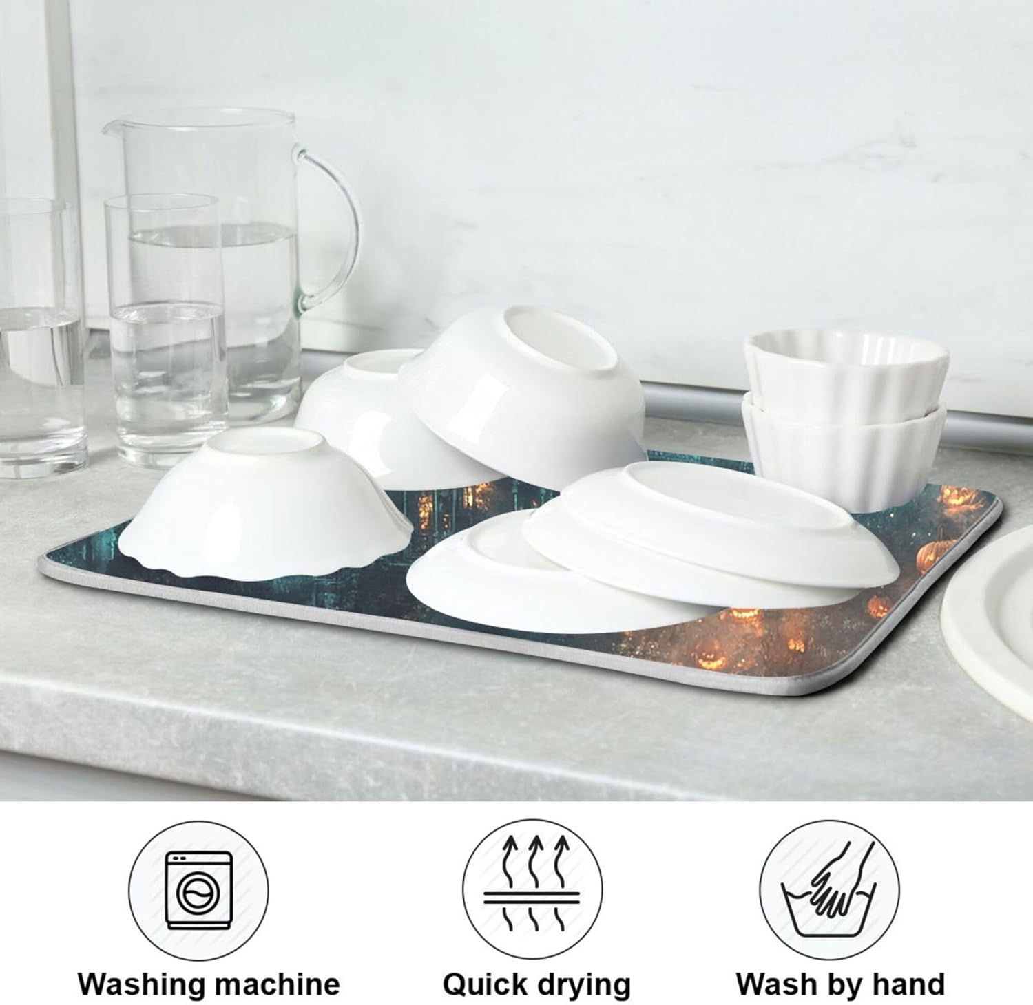 Halloween Castle Dish Drying Mat for Kitchen Countertop 18x24 Spooky Witch Pumpkin Lantern Large Drying Mat Reusable Quick Dry Dish Sink Mats Easy Clean Decorative Essentials