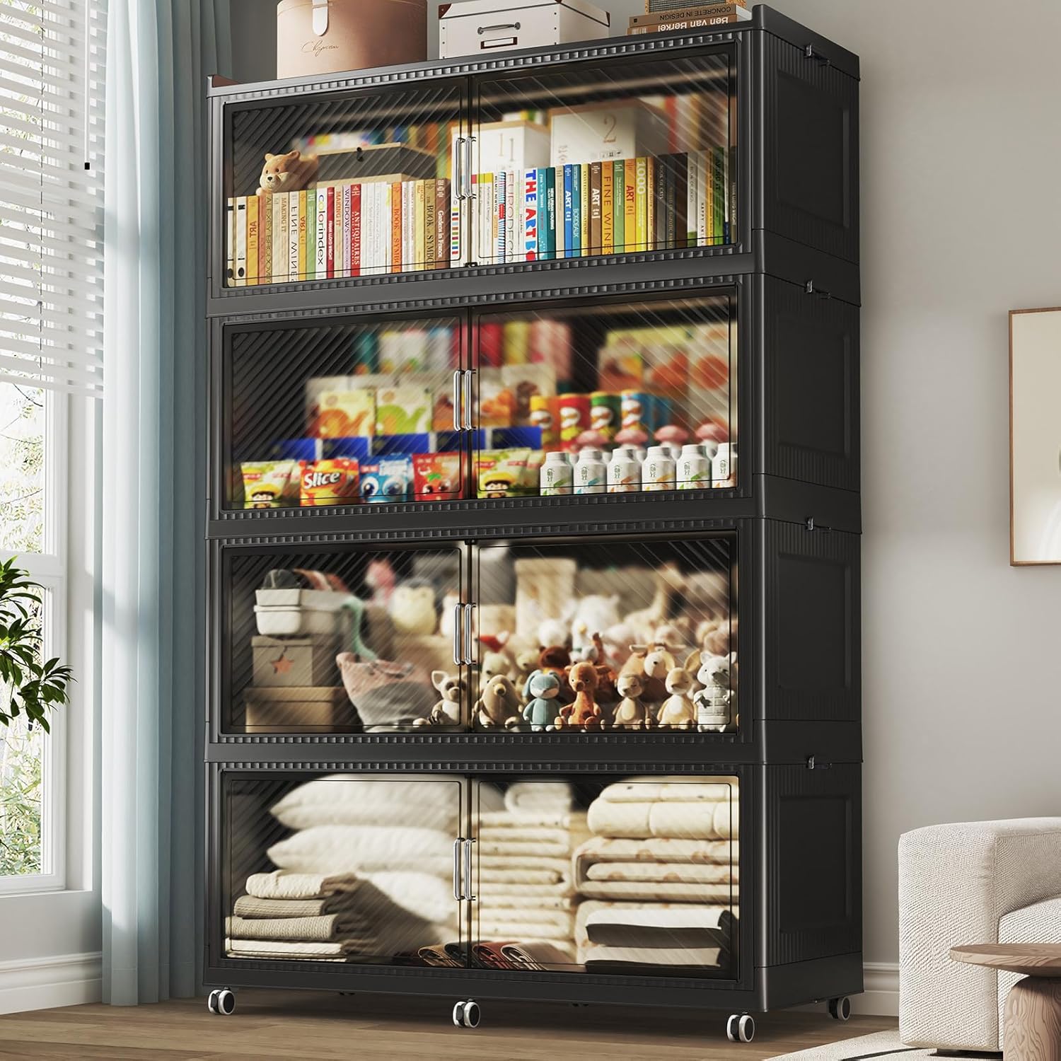 - 【Two Ways to Open & Magnetic Doors】The collapsible storage bins with lids and wheels feature a dual access way, allowing for both top and front door openings, and with clear brown windows for easy visibility. The super huge storage bins with open front doors are equipped with magnetic lock buckles to prevent dust from entering the cabinet.