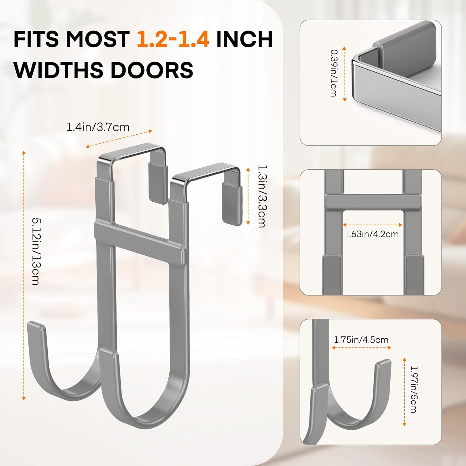 FYY Over The Door Hooks - 4 Pack Heavy Duty Dual-Hook Organizer Hanger with Non-Slip Rubber for Towels, Clothes, Hats & Bags Use in Bathroom, Bedroom, Kitchen - Fits Interior Doors Up to 1 3/8" Grey