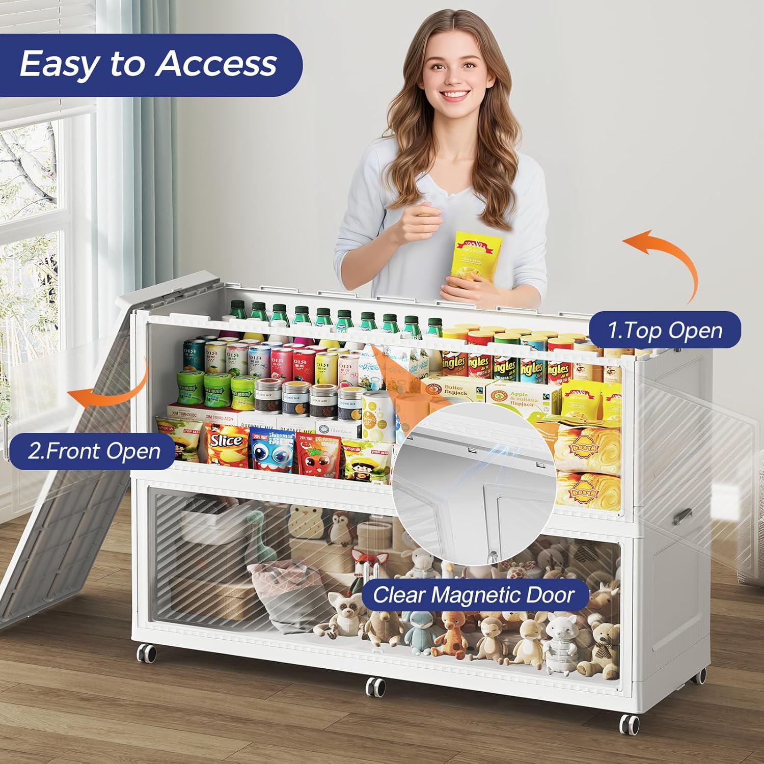 - 【Two Ways to Open & Magnetic Doors】The collapsible storage bins with lids and wheels feature a dual access way, allowing for both top and front door openings, and with clear brown windows for easy visibility. The super huge storage bins with open front doors are equipped with magnetic lock buckles to prevent dust from entering the cabinet.